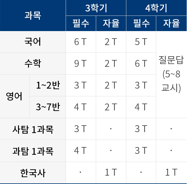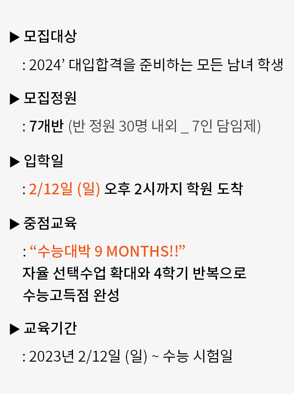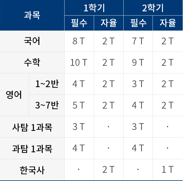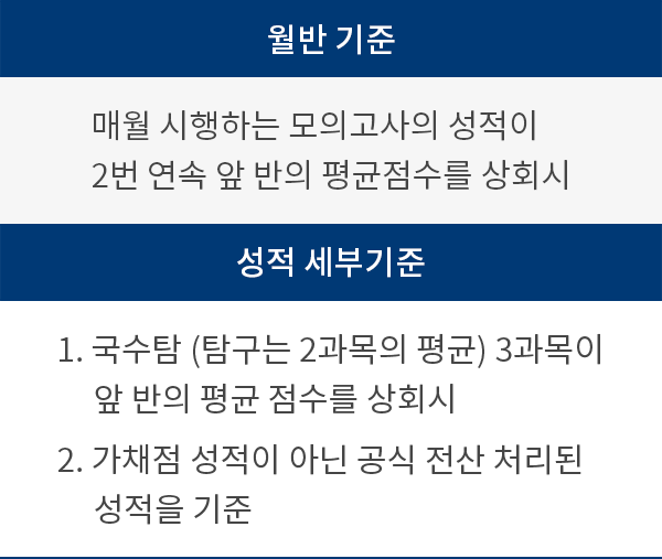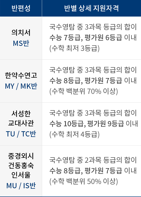 - 각 반에 해당하는 지원자격을 갖춘 경우 반편성고사 성적과 무관하게 해당 반에 배정됩니다. 단, 입학당일 반편성고사 성적이 우수할 경우 인원 상황에 따라 상위반으로 배정될 수 있습니다.