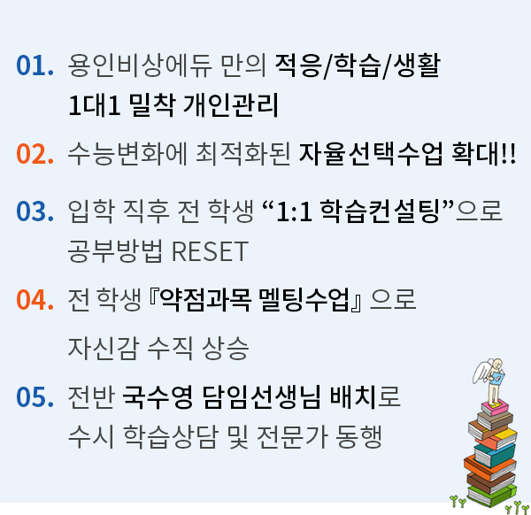 - 입학당일 반편성고사 결과는 전 학생 “1:1 학습컨설팅”의 상담자료로 활용됩니다.