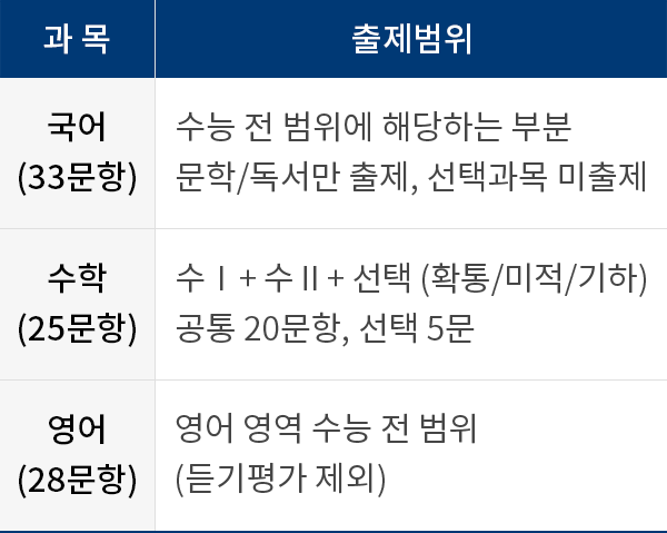 - 입학당일 반편성고사는 전 입학생 대상으로 국어, 수학, 영어 과목을 실시합니다.